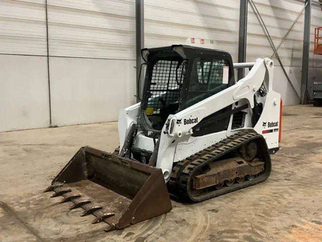 Mini pala Bobcat T590 con cadenas y alto caudal. Ideal para trabajos de construcción y paisajismo.